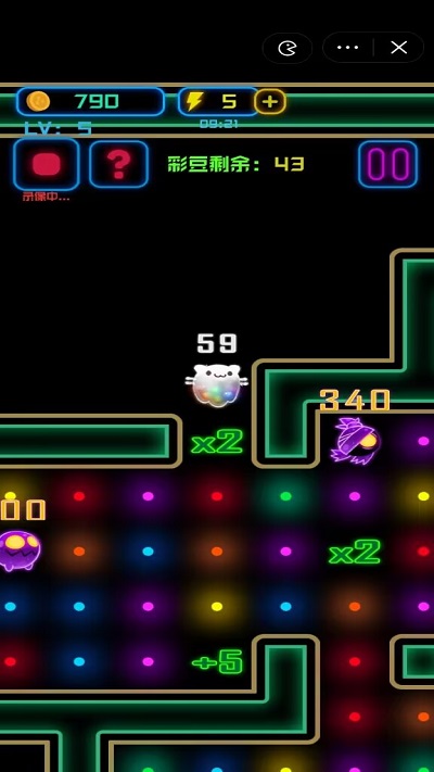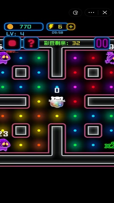 这是一个休闲解压小游戏,在传统吃豆玩法上进行创新,加入数值战力比较玩法。游戏画风为流行赛博朋克风格,炫丽多彩,霓虹灯光璀璨,玩家需要操控可爱的幽灵小猫,打败邪恶的幽灵。在不停变换关卡场景的地图中来打败更多敌人,吃到更多豆子吧。