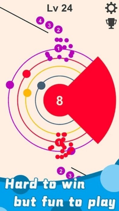 画面顶端和底端各有两列小球,点击屏幕会同时射出这两个轨道上的球球。中心圆球上面的数字代表了剩余的小球数,将所有小球送上外围的圆环轨道则游戏通关。