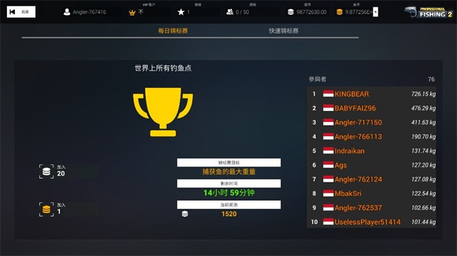 专业钓鱼2中文破解版极具真实感的钓鱼游戏等你来体验。在这里你可以自己一个人钓鱼,或是加入到锦标赛中国和全球各地的玩家一同展开垂钓竞技,看看谁才是真正的钓鱼高手,还有多种高级渔具可供解锁体验。