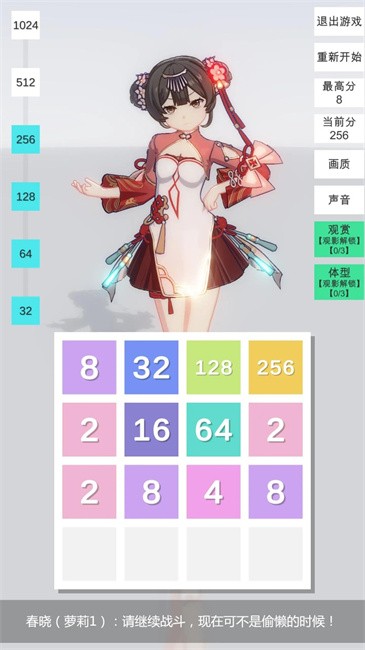 一款零付费零内购,专属于二次元的2048游戏。在保留2048传统玩法的基础上,增加了3D二次元角色春晓的陪伴。玩家通过合成更高数字来解锁春晓的海量分镜,包括动作、语音、视角等。游戏还提供了可以改变角色年龄和身材的体型控制功能,以及360度无死角的观赏功能。