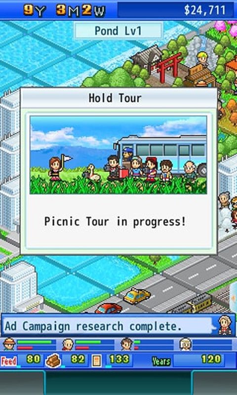 鱼潭公园(Fish Pond Park)是Kairosoft开发的一款模拟经营类游戏。这款新作依旧走该路线,不过视角又有所不同,游戏开始玩家将拥有一片光秃秃的鱼塘,你要做的就是不断开发鱼塘的利用价值来吸引游客进行营利。你可以加入多种服务,如雇佣导游,建造旅馆、温泉、或者更多其它的建筑,将其打造为田园般的旅游胜地,最终进入全国自然景点排名前列。