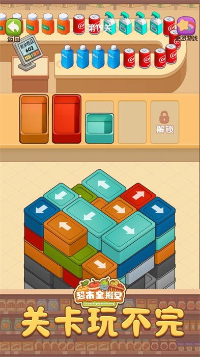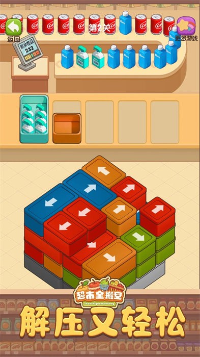 一款整理超市货架消除物品的休闲游戏,游戏中需要玩家根据商品的颜色,按顺序搬下堆叠的货架,把它们装到货架中,游戏中有各式各样的物品等待着玩家装入盒子中,游戏休闲有趣,快来挑战一下。