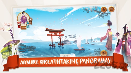 2.游戏完美还原日本传统文化景观,精致的美术风格呈现巍峨山峦、宁静海滨与和风建筑,配以古典背景音乐,营造出宁静平和的东方美学氛围。