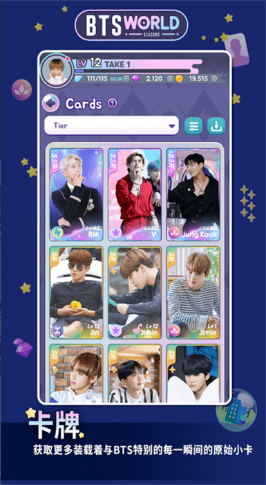 装载着BTS特别瞬间的原始小卡!卡牌中乘载的不仅是回忆,还有各种不同的技能,开始充满感动与乐趣的旅程。