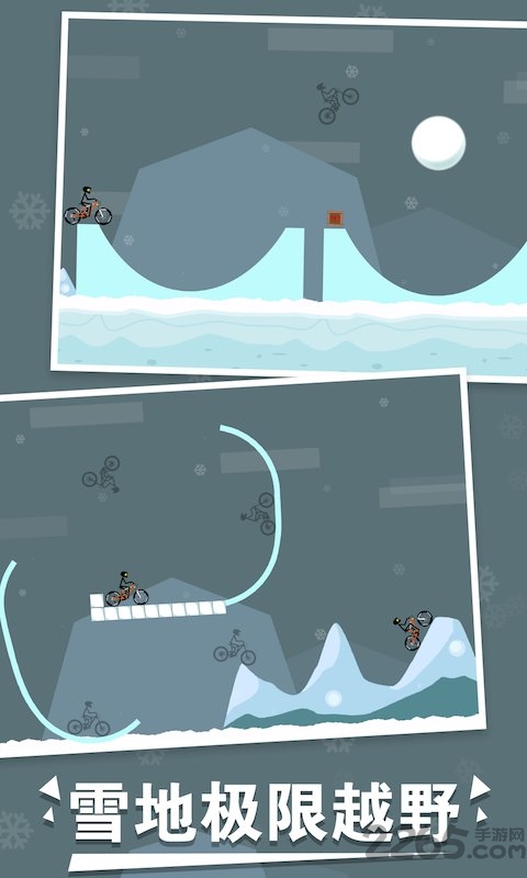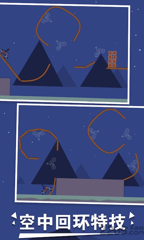1、玩家需操控火柴人驾驶自行车在各种赛道飞跃并完成空中翻转等特技。