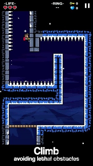 1、玩家需操控像素少年在陡峭墙壁上攀爬并躲避各种致命陷阱。