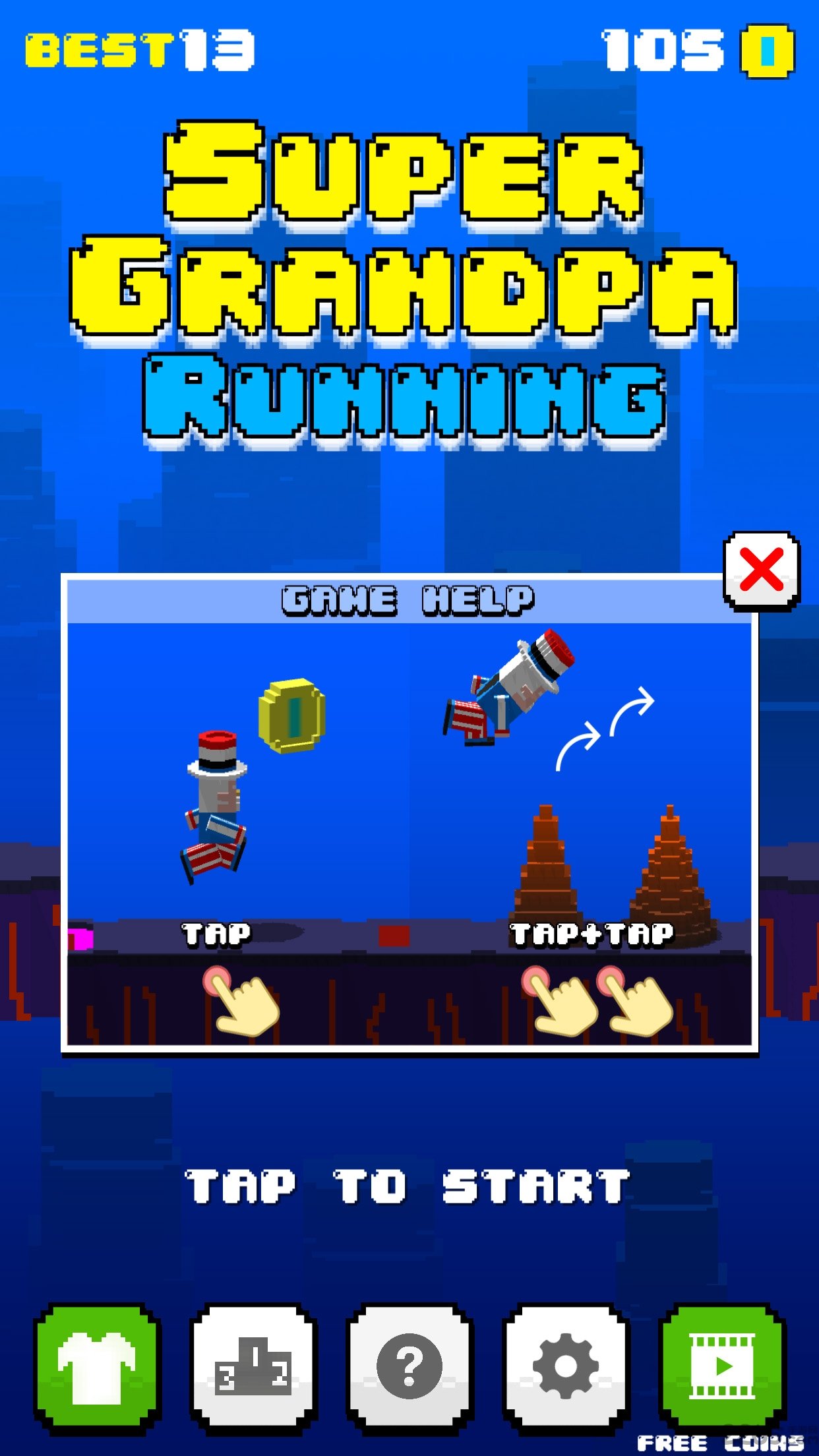 《特工爷爷大冒险》是一款极简风格的跑酷独立游戏,它简单但又趣味十足,感觉就象在玩超级马力。仅需要点击即可,点击跳跃,两次连续点击为二段跳,通过不停地奔跑和跳跃来躲避障碍,机关,火焰,获得更多的金币。并以获得金币数进行全球玩家排行。