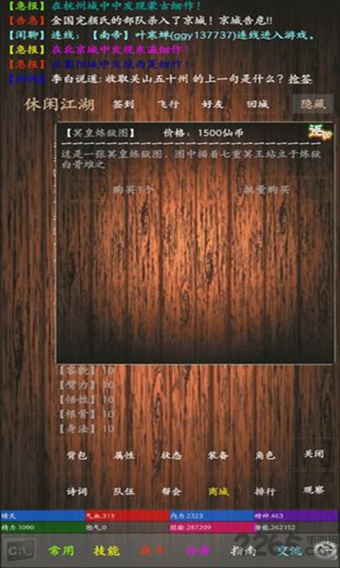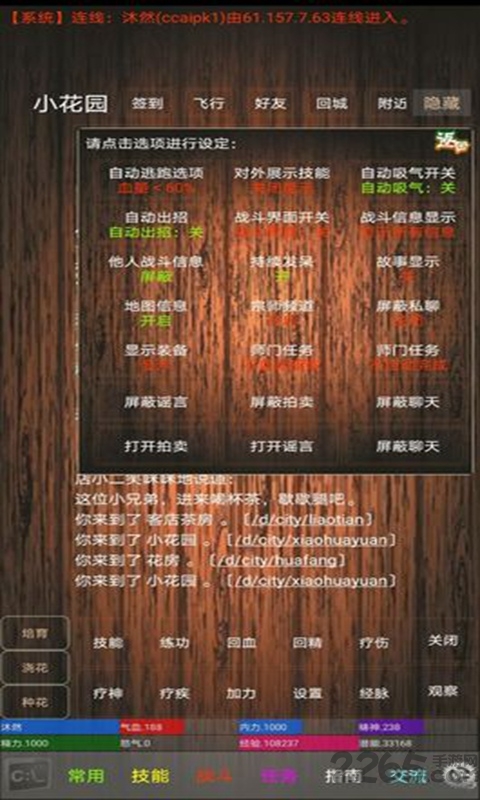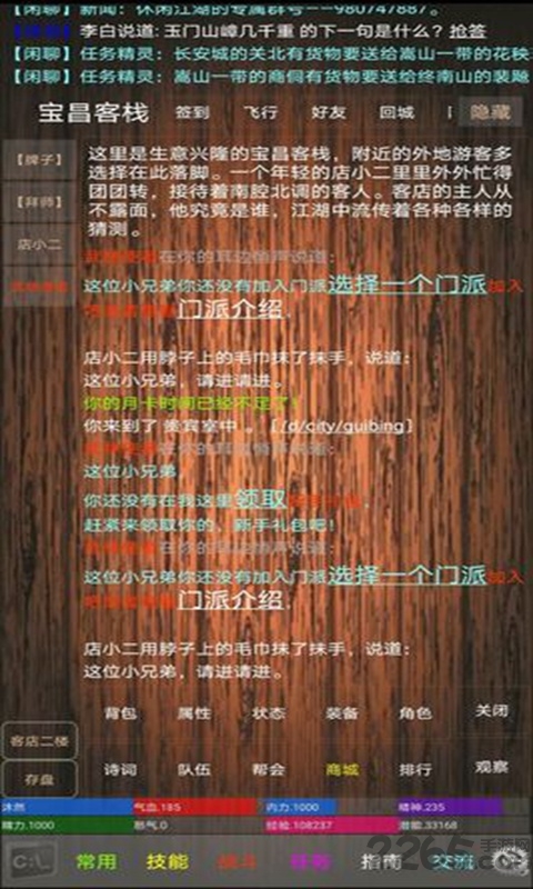 休闲江湖养成游戏是一款武侠题材的rpg游戏,采用了mud文字挂机玩法,在这里用文字就为你构建了庞大的武侠世界,你可以学习武功,习得心法,也能钓鱼养花,做个休闲侠客,感兴趣的朋友赶快来2265安卓网下载吧!
