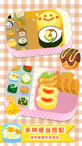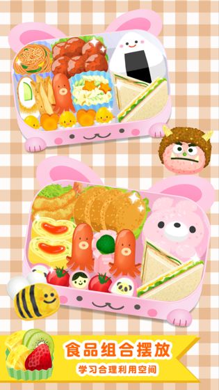便当小能手游戏是一款卡通画面打造的休闲美食游戏,游戏中玩家需要为妈妈打造各种各样的便当,挑选自己喜欢的食物搭配,进行合理的摆放和科学健康的组合,打造美味又健康的便当.