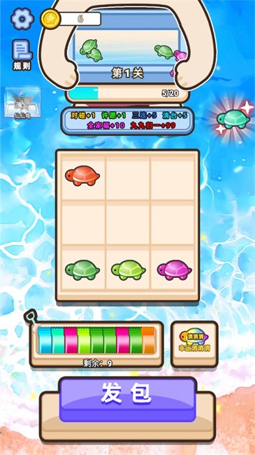 5、如果连续五次都拆出不同颜色乌龟会触发清台,获得5个订单,订单耗尽后游戏结束。
