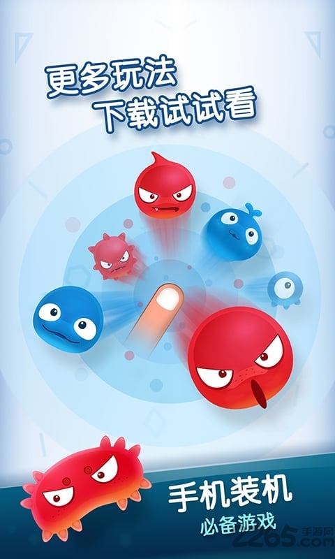 益智休闲类游戏,集成经典小游戏红蓝大作战1的休闲娱乐对战游戏本游戏中包含了14个竞争小游戏,在游戏中不停狂点屏幕病毒会不断膨胀,看谁的手速快,能压扁对手。点击屏幕中的小病毒,让屏幕中所有小病毒的颜色相同。游戏中一方控制红色病毒,另一方控制蓝色病毒,开始前选择比赛次数。