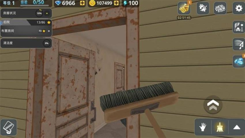 1、首先进入游戏主界面,你能看到一座待翻新的老房子。从左上角查看你的等级、钻石金币数量和电量,接着点击右下角的手型或刷子图标。