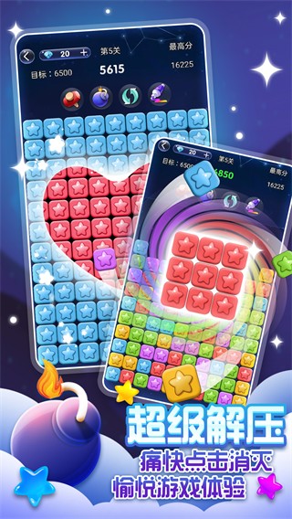 2、单次消除的星星数量越多,可累计的积分也会相应提高,不断挑战更高分数带来持久趣味性。