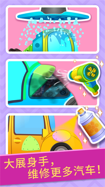 宝宝修车店开业啦!作为一名合格的店员,你需要帮助顾客把汽车清洗干净,并且修理好,然后给汽车做美容,改装成顾客喜欢的样子,最后,给汽车拍张照,你的任务就完成啦!帅气拉风的汽车就这样闪闪发光! 宝宝修车沙龙店,来一次惊人的洗车冒险吧!