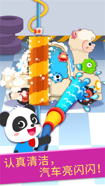 打开高压水管,瞄准污渍,发射强力水柱,耶!污渍被冲走了,接着移动花洒,冲洗干净车身。擦亮车窗,清理空调灰尘,车内、车外都要清洁,汽车变得亮闪闪!