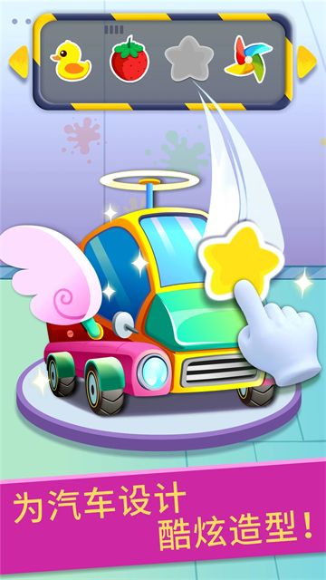 为汽车设计造型吧!先装饰内部:金色铃铛挂坠、七彩坐垫,创意饰品,把车内装扮得美美哒!接着设计车身,挑选恐龙、火箭造型的贴纸,粘贴在车身,瞬间提升汽车时尚感。