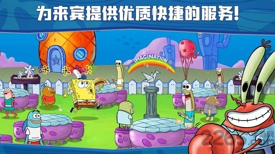 以经典动画海绵宝宝为主题设计的餐厅经营类游戏,尊重了动画元素的设计,以原创的角色形象带给玩家一种轻松互动模式的休闲经营乐趣,欢乐十足,神奇的蟹堡王和珊迪的家里,或者海绵宝宝家门口经营餐厅,不断的开发出新品种的食物,满足顾客们额需求才能赚很多钱。