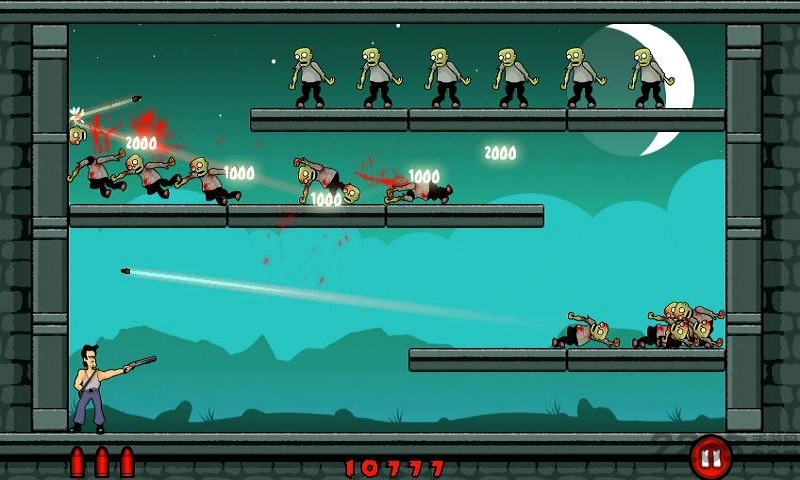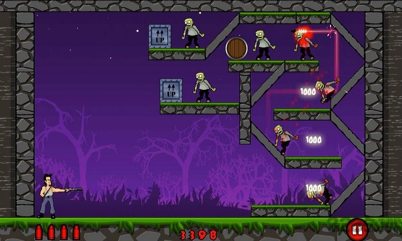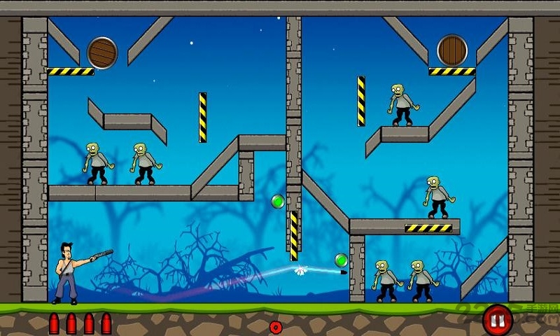 所以你必须要开动脑筋了,你需要利用子弹的反弹来消灭大部分的僵尸