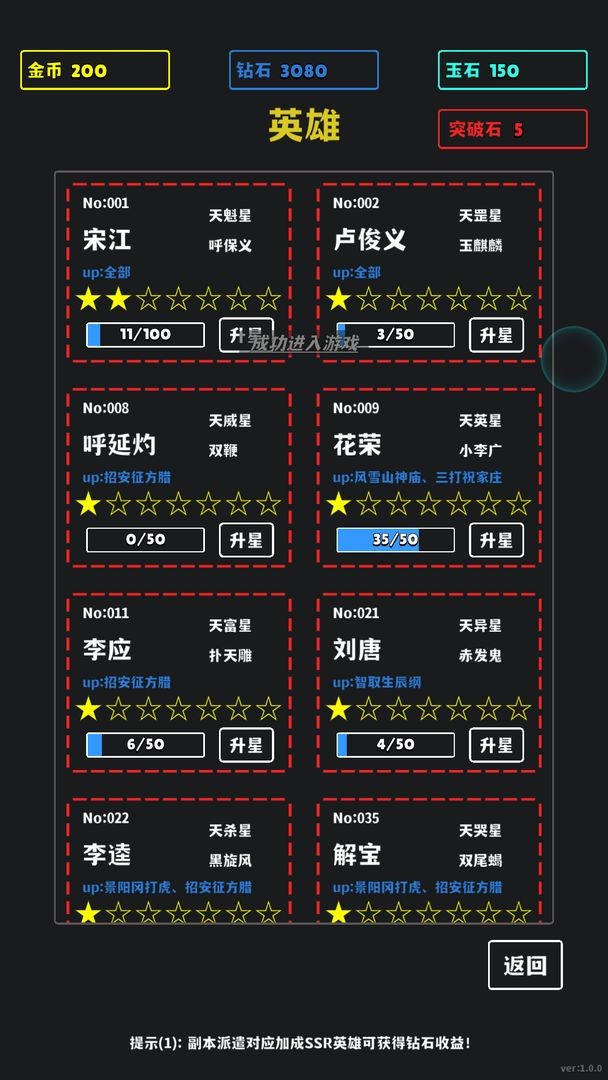 放置十连抽手游是一款画面简易的文字冒险游戏,以经典水浒故事为背景,融合了卡牌元素,为玩家带来一个非常独特的文字游戏体验.玩法非常的简单,体验十分休闲.感兴趣的朋友欢迎来下载.