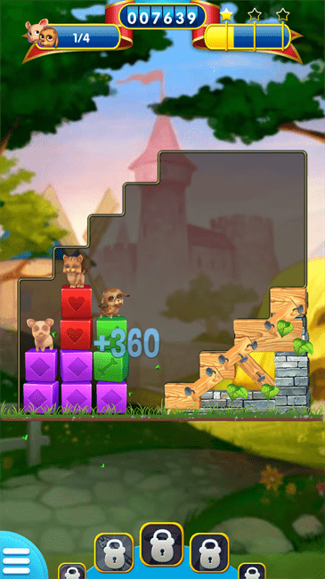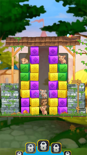 3、匹配两个或更多同色砖块来移除障碍,从邪恶的宠物大盗手中解救宠物!