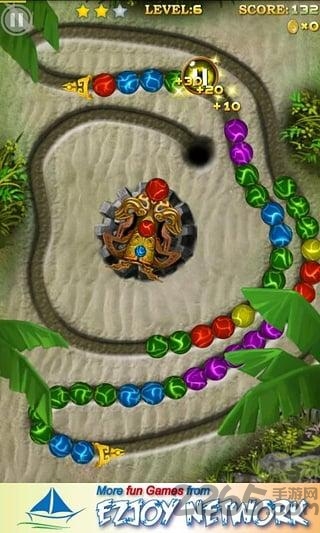 1、点击屏幕控制青蛙发射彩珠以消除轨道上滑行的彩珠队列。
