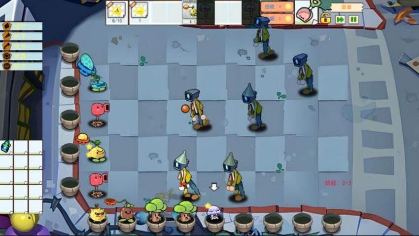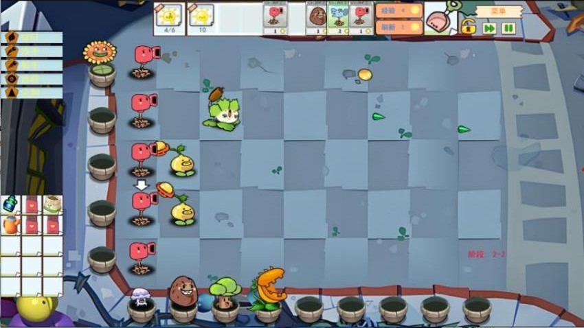 1、通过拖拽操作在草坪网格部署植物,根据僵尸类型选择相克植物品种。