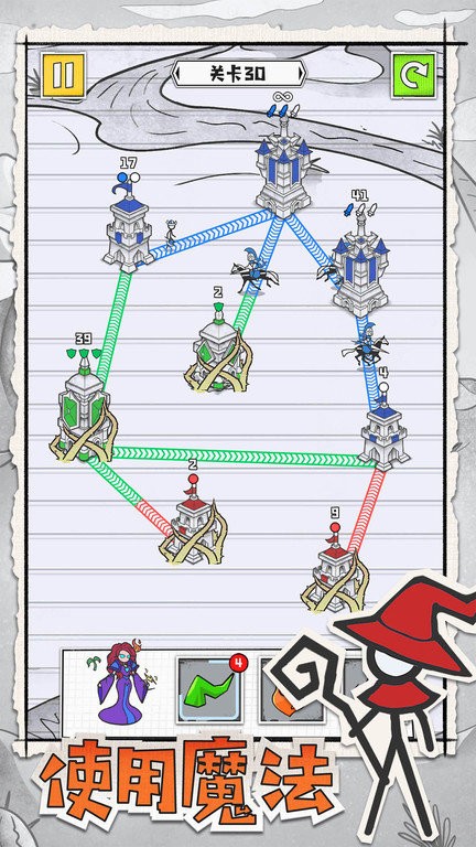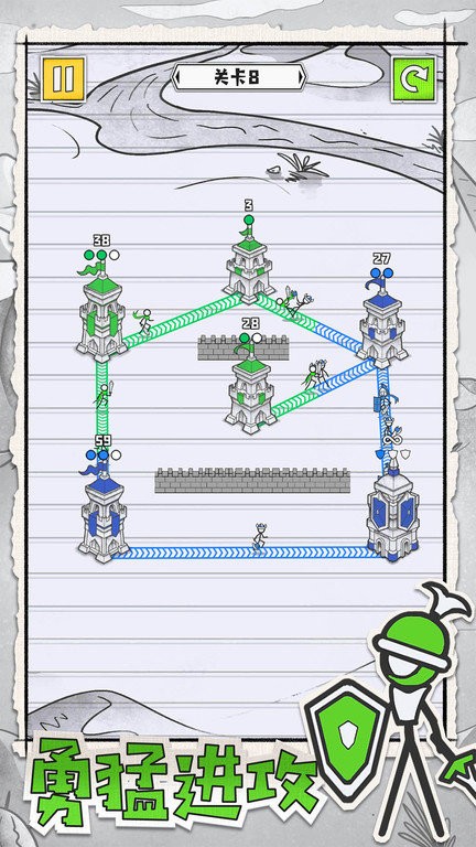 1、拖动城堡间建立连接路线输送火柴人士兵。