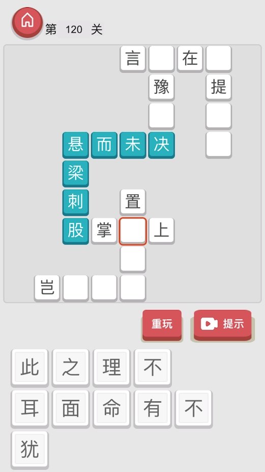 将成语以接龙形式分布在一个棋盘内,隐藏到一部分文字到备选答案区,玩家通过现有情况猜测可能是哪个成语。每填写一个成语都会实时提示是否正确,当一个成语完成则变成不可修改状态。全部答对可以进入下一关。