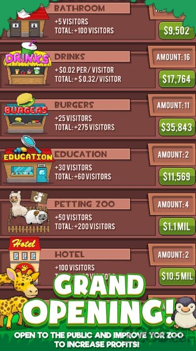3.在这个看似无聊的游戏中,你的动物园将继续成长,并为你赚钱,可以用来解锁像猴子、熊猫、大猩猩和狮子这样的新动物园动物!