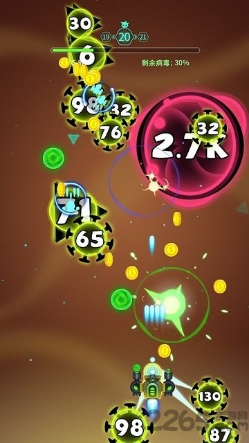 3、滑屏射击病毒,控制飞船完成第一关挑战。