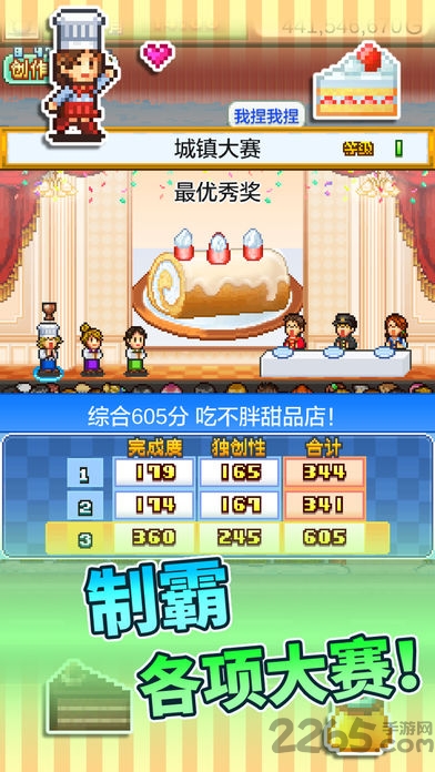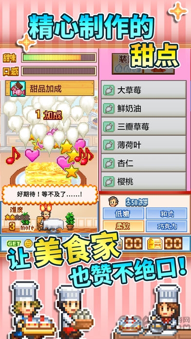 它是以经营一家西式蛋糕店为主题的游戏,玩家除了采用各种常规的面粉、奶油、鸡蛋、果酱等食材制作蛋糕招待顾客之外,更要突出“创作”两个字,你可以尝试用海绵蛋糕加草莓和鲜奶油制作出新口味的配方,从而诞生出高级甜点,吸引更多顾客慕名前来。同时从小镇到世界级别的甜点大赛也会陆续开展,为了打响招牌,你可以拿出自己最得意的创作蛋糕参赛,比赛获胜之后人气也会提升,客流量大增。