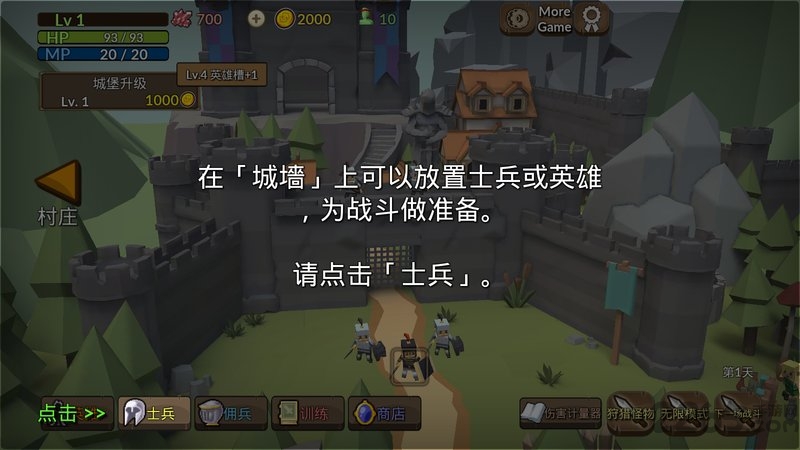 2、雇佣不同兵种并布置在城墙上抵御怪物。