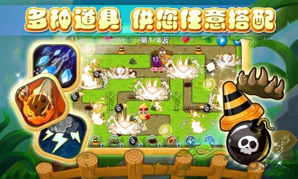 2、根据地形使用不同道具阻挡多波怪物进攻。
