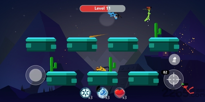 赚去金币,可以用来购买武器,或者提升属性,18种武器、9种装备、3类道具选择。每个一关都是不同的场景,会出现很多机关,要及时躲避,掉下去就GG,都是电脑人物,所有很菜,只有操作不失误,就能顺利过关,道具要及时使用。坚持战斗2Stickfight 2 Infinity中有着无尽的关卡,18种新武器,超过60个关卡,基于物理知识打造,每一个关卡都有不同的场景,需要及时的躲避才可以获得奖励,只有攻击、跳跃以及左右方向键,操作比较简单,不需刻意的瞄准,无脑射击就行。4名火柴人同时战斗,相互射击,武器会随掉落,包含了狙击枪、喷火器、冲锋枪等多种武器。
