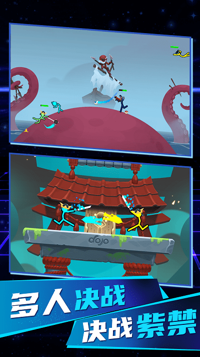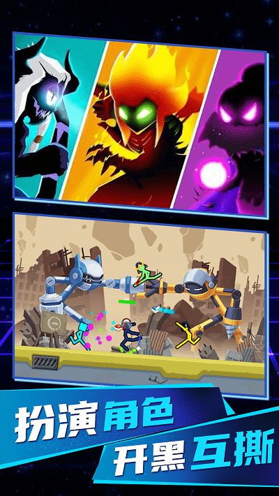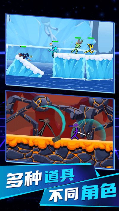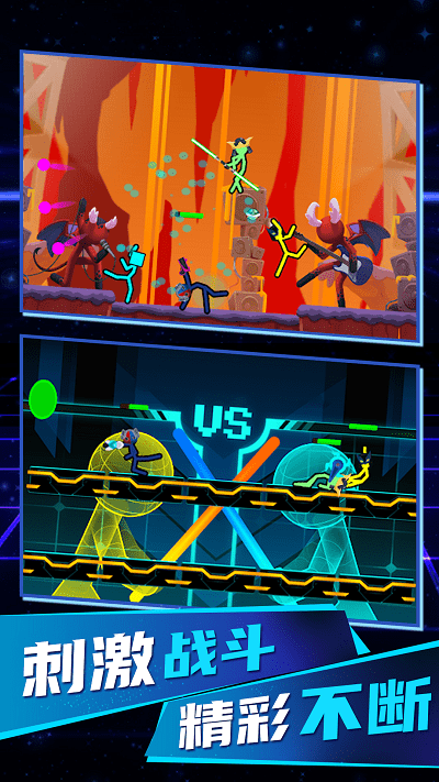 玩家在游戏中操控一个火柴人,利用简单的横版摇杆操作操控火柴人进行热血格斗。