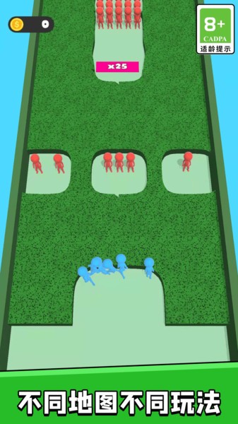 2、成长系统:部队规模会随着关卡推进不断壮大,通过收集场景中的士兵增强实力。