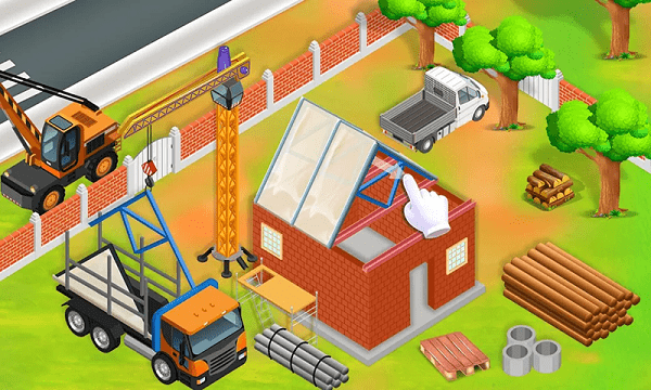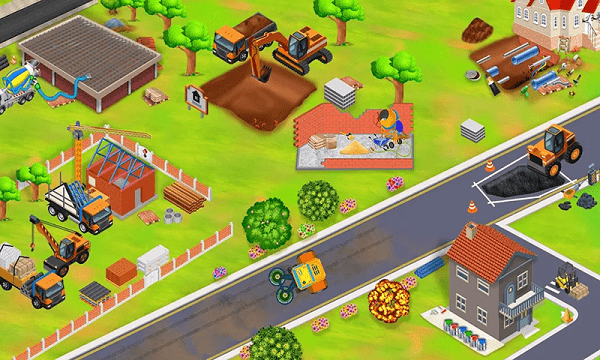 画2265玩家喜欢的颜色的房屋用挖掘土建设和创造屋顶瓦工:用混凝土搅拌机建立一个完整的小镇。