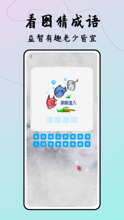 2.应用包含4大部分内容,分别是成语拼拼看、成语接龙、成语消消看、看图猜成语