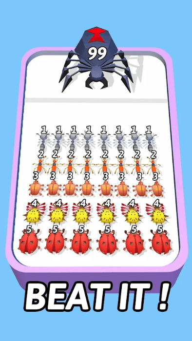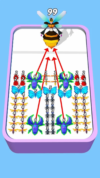 合并大师昆虫融合是一个合成对战的昆虫游戏,您需要快速思考,通过在战场上梳理昆虫来击败所有敌人。