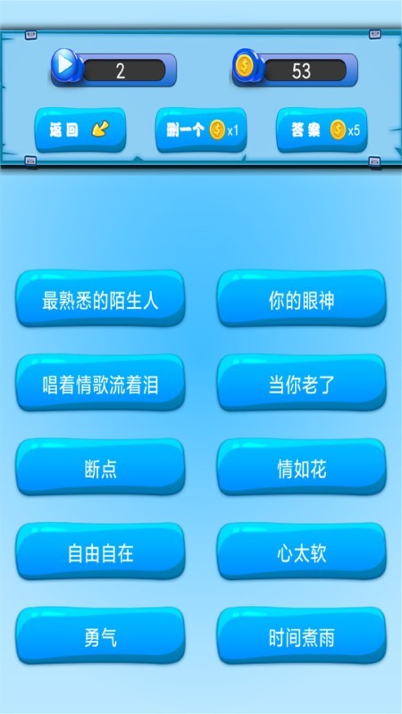 以猜歌名为主的娱乐游戏,包含有多种模式:前奏猜歌名、记忆猜歌词、听歌曲猜名、听音调猜名等。包含众多的经典老歌,充分考验您的音乐知识,您需要聆听前奏或者音调后,再从给出的选项中选择正确的歌名或者歌词,作为猜歌达人的你,赶紧来挑战吧!