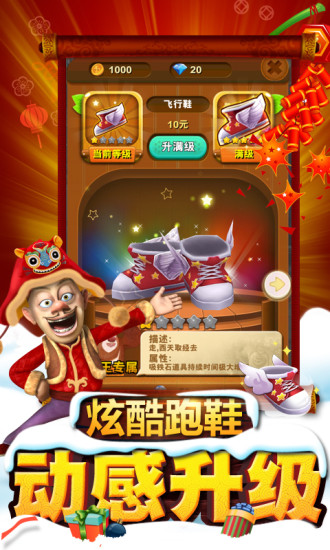 1、玩家操控角色进行竖版跑酷沿途收集金币与福利。