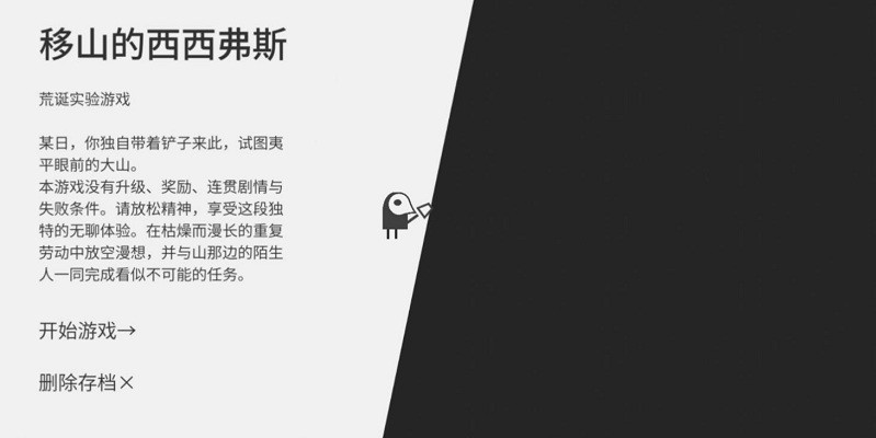 西西弗斯移山记手机版是款黑白风格的文字游戏,游戏里玩家要帮助西西弗斯将眼前的大山移开,一点点的挖掘,运输,通过自己的不断努力将这座大山成功的移开。游戏玩法简单轻松,快来下载试试吧!