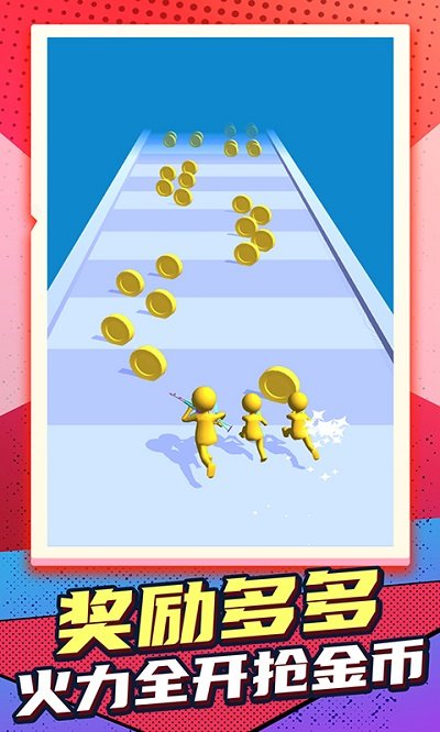 卡通游戏,在这款游戏中玩家将会需要不断召集橡皮小人扩大队伍,在游戏中玩家控制着自己的橡皮人在赛道上不断的奔跑收集你前方的金币,前方有众多敌人陷阱,躲过它们,路的尽头需要与敌人搏斗,人数越多能夺下城堡的机会就越大!