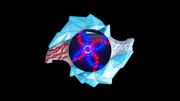 1、多样化特效:不同晶石插入后,中间水晶展开的显示屏呈现出各异的红蓝旋转光效,为每一次变身赋予独特的视觉冲击。