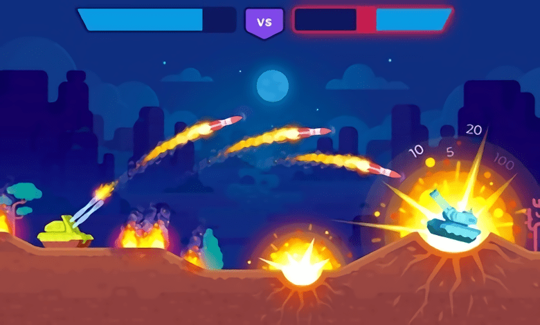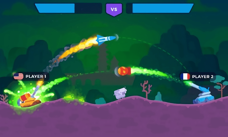漫画游戏风格,超多不同地形的游戏关卡,寻找最佳战斗位置,射击炮弹。