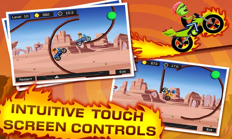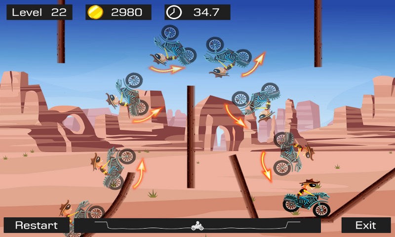 极限飞车游戏是一款比较休闲娱乐的摩托车题材赛车游戏。游戏玩法操作比较简单,只需要控制好摩托车通过赛道到达终点即可!但是不要小看这款游戏哦,你的技术越高,得分越高,那么得到的金币就越多。所以如果你能够在空中旋转360度就可以获得额外的奖励呢!赶紧来下载游戏秀出你的技术吧!