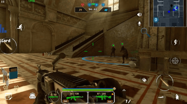 5、玩家可以利用虚拟键盘控制角色移动,右下方的按键可以进行射击、换弹、半蹲、趴下等多种功能;