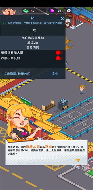 1、进入游戏,会有秘书指引,恭喜老板,您的快递公司正式营业啦!我是您的秘书桃心,我将帮助您出任CEO、迎娶白富美、走上人生巅峰,想想是不是还有点小激动?