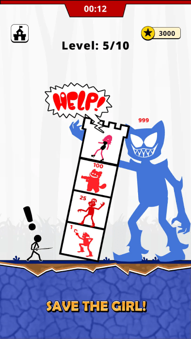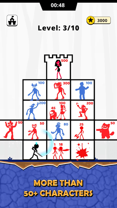 火柴人时代塔防之战游戏是一个闯塔的塔防手游,玩家们需要通过一层一层的怪物然后击败最高层数的敌人,这里有很多不同的小怪,只需要击败小于你数字的怪就会增加,就这样无限的加成,看看自己能走多远,克服困难,一路向前。