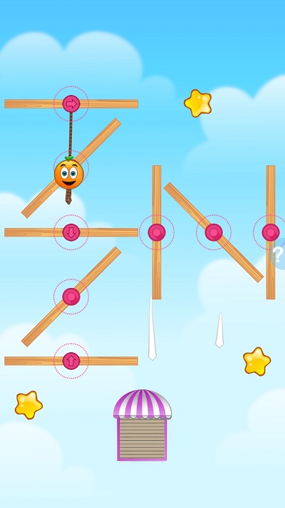 碰到绿色或者红色的圆钮,它们会创建绳子挂住橙子。
